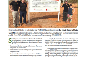Article sur le projet qui a été initié et est réalisé par l’ONG-D luxembourgeoise Le Soleil Dans la Main (ASDM), en collaboration avec Lëtzebuerger Landjugend a Jongbaueren – Service Coopération a.s.b.l. (LLJ-SC) et SOS Sahel International Luxembourg (SOSSILUX). http://jongbaueren.lu/wp-content/uploads/2017/05/ONG-NEWS-2017.pdf