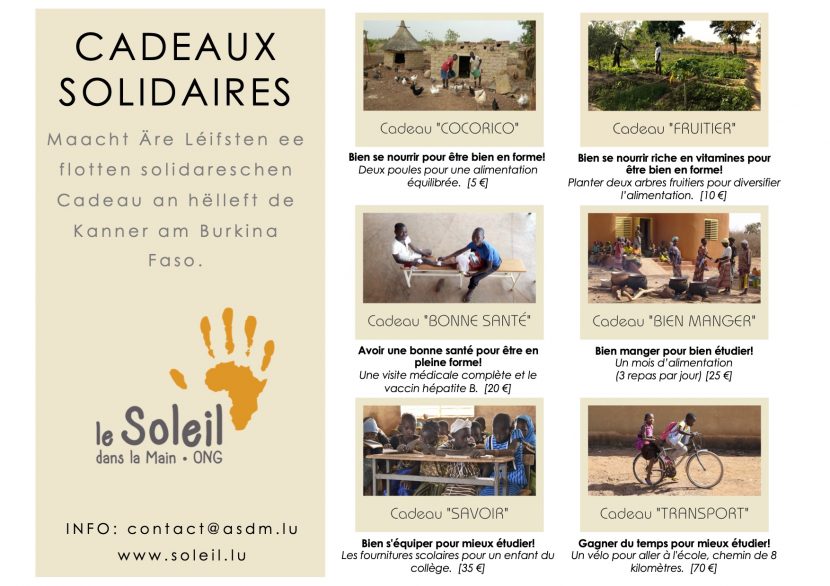 Les jours de Noël s’annoncent! 🎄🎁 Vous cherchez un cadeau original pour offrir à quelqu’un? Offrez un de nos cadeaux solidaires et aidez au même temps les enfants au Burkina Faso! 1) Téléchargez et remplissez le formulaire. 2) Envoyez-le à contact@asdm.lu . 3) Versez le montant par virement ou par Digicash sur notre compte. 4) […]